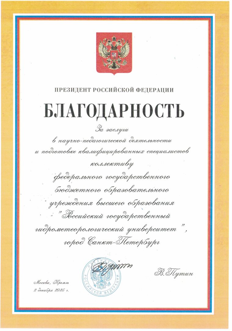 Благодарность от имени Президента Российской Федерации Владимира Владимировича Путина вручена коллективу Российского государственного гидрометеорологического университета. Высокая награда присуждена за заслуги в области научно-педагогической деятельности и подготовку квалифицированных специалистов.