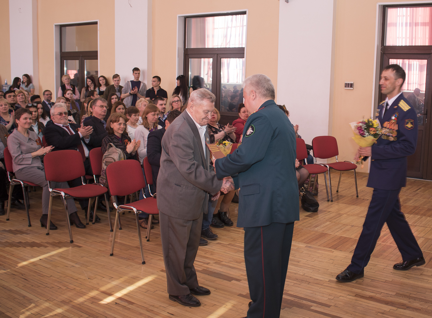 «Студенты РГГМУ – ПОБЕДЕ!»7 мая в актовом зале учебного корпуса РГГМУ (Малоохтинский пр., 98) состоялось традиционное праздничное мероприятие «Студенты РГГМУ – ПОБЕДЕ!», посвященное 73-ой годовщине победы советского народа в Великой Отечественной войне 1941-1945 годов.Чётко чеканя шаг под музыку песни «Священная войн», знамённая группа внесла в зал государственный флаг Российской Федерации и знамя Победы, хор РГГМУ исполнил государственный гимн Российской Федерации. Торжественная церемония придала празднику особую значимость. «Мы помним! Мы гордимся! Мы чтим!» - именно эти важные для каждого гражданина слова стали девизом праздника Победы в РГГМУ, праздника чести и славы ветеранов-участников войны, жителей блокадного Ленинграда, детей войны. В праздничном приказе ректора университета «в честь празднования 73-й годовщины победы советского народа в Великой Отечественной войне 1941-1945гг.» было особо отмечено, что «с годами всё величественнее представляется подвиг нашего народа, отстоявшего свободу и независимость Родины, избавившего страны Европы от нацистского порабощения». И наш священный долг – сохранить в сердцах память о тех, кто завоевал Победу, отдал свою жизнь во имя счастья будущих поколений и чтить ветеранов войны, тружеников тыла, чьи боевые и трудовые свершения заслуживают восхищения и глубокого уважения. В День Памяти всегда особую ценность имеют слова самих ветеранов Великой Отечественной войны. Воспоминаниями, своим восприятием войны поделился ветеран войны, житель блокадного Ленинграда, кандидат географических наук, профессор Богаткин Олег Георгиевича. Олег Георгиевич долгие годы трудиться на кафедре метеорологических прогнозов нашего университета. Ветераны РГГМУ на празднике были окружены особым вниманием. Подарки и цветы, тёплые слова благодарности, пожелания здоровья и долгих лет жизни – это та малая дань нашей безмерной любви за мир, свободу, счастье жить на Земле. Творческая молодёжь вуза с трепетом отнеслась к подготовке праздничной программы для любимых ветеранов. В исполнении хора РГГМУ прозвучали знакомые всем песни военного времени и песни в память о героическом прошлом нашего народа. Зрители смогли побывать на инсценированном привале бойцов Красной армии: послушать отрывки из поэмы А. Твардовского «Василий Тёркин», частушки с передовой, увидеть солдатские танцы под баян и даже побывать на выступлении артбригады. В зале царила самая тёплая атмосфера. Голос Левитана, Минута Молчания, уроки Памяти сблизили всех. Зал аплодировал и подпевал, некоторые плакали. И всё это вместе – семья Гидромета. Победе нашей не один десяток лет, Но как нам близко то, что уже в прошлом. Дай Бог вам, ветераны, долгих лет! ![]() ![]() ![]() ![]() ![]() ![]() ![]() ![]() ![]() ![]() ![]() ![]() ![]() ![]() ![]() ![]() ![]() ![]() ![]() ![]() ![]() ![]() ![]() ![]() ![]() ![]()