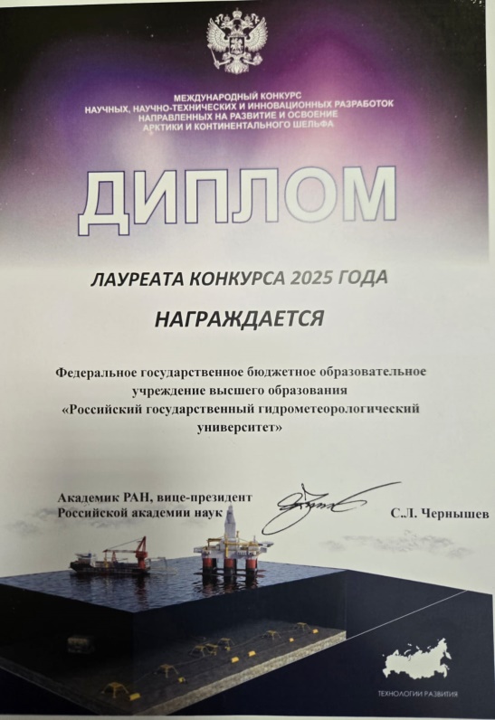 Итоги Конкурса «Арктика 2025»08 октября 2025 г. в рамках Международной выставки и конференции по освоению ресурсов нефти и газа Российской Арктики и континентального шельфа стран СНГ были подведены итоги Конкурса научных, научно-технических и инновационных разработок, направленных на развитие и освоение Арктики и континентального шельфа. Конкурс проводится с 2014 года при поддержке Правительства Российской Федерации. Экспертная межведомственная комиссия, в состав которой вошли ведущие ученые Российской Академии Наук, представители Федерального Собрания Российской Федерации, федеральных органов исполнительной власти, ведущих научных, исследовательских, конструкторских и проектных институтов и организаций России, определила лауреатов и победителей конкурса. В этом году лауреатом Конкурса определен ФГБОУ ВО «Российский государственный гидрометеорологический университет» с представленным научно-исследовательским проектом помощника ректора по вопросам Арктики Бразовской Яны Евгеньевны на тему «Технологии прогнозирования и оценки антропогенной нагрузки на арктическую природную среду от морского судоходства». Вице-президент Российской академии наук Сергей Леонидович Чернышев поздравил лауреатов и пожелал новых интересных научных проектов. Поздравляем и желаем новых побед! ![]() ![]() ![]()