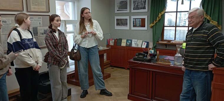 Будущие журналисты познакомились с прошлым журналистики В рамках учебной практики студенты второго курса института «Полярная академия», обучающиеся по направлению подготовки «Журналистика и публицистическая деятельность», побывали в только что открывшемся музее «История петербургской журналистики». На экспозиции наглядно прослеживаются этапы возникновения различных типов средств массовой информации; одновременно представлены знаковые для развития журналистики личности. Открывает музей Пётр Первый, создатель и первый редактор газетного листка в России. Как российский император всё успевал? Последний царствовавший Романов — Николай Второй — подписал Указ о создании в Санкт-Петербурге первого информационного агентства, известного сегодня как ТАСС. Очень личная для всех ленинградцев часть экспозиции, посвящённая работе СМИ в годы войны: метроном, который временами был единственным свидетельством того, что город жив; сатира "Боевого карандаша" и портрет музы блокадного города, поэтессы и журналистки Ольги Берггольц. Но самое большое удивление вызвал рассказ Петра Котова у витрины фотоаппаратуры прошлого века о технологии печати аналоговых фотографий. Пётр Котов — исполнительный директор Союза журналистов Санкт-Петербурга и Ленинградской области, пришёл в журналистику как фотокорреспондент, изучив ещё подростком технологию фотодела, а завершил карьеру главным редактором федерального издания "Парламентская газета". Он один из создателей музея и человек, задающий настрой в Доме журналиста. Хочется верить, что знание истории журналистики повысит ответственность студентов перед будущей профессией! ![]() ![]() ![]() ![]() ![]()